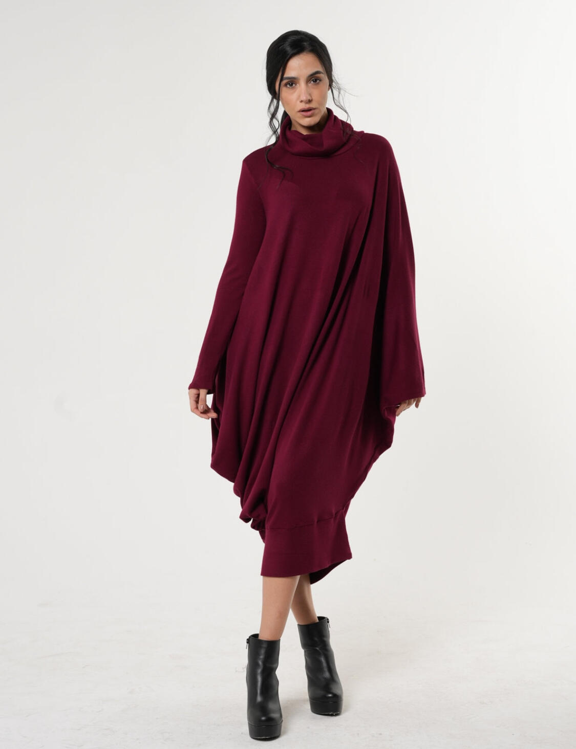 هذا الفستان هو الأكثر راحة على الإطلاق – خفيف كأنه غير موجود، وأنيق بشكل يلفت الأنظار! يتميز بقصة غير متماثلة وتصميم فضفاض يناسب جميع الأجسام. أحد الأكمام عادية والأخرى واسعة يمكن ارتداؤها لأعلى أو لأسفل لإطلالة عصرية مرحة. مصنوع من مزيج ناعم من الصوف والقطن ليمنحك مزيجاً مثالياً من الدفء والأناقة اليومية.