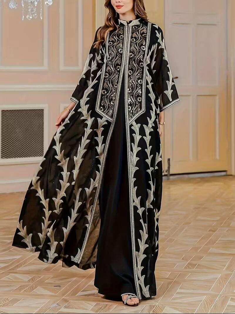Women’s Elegant Arabic Abaya Dress with Golden & Black Islamic Embellishments.-L